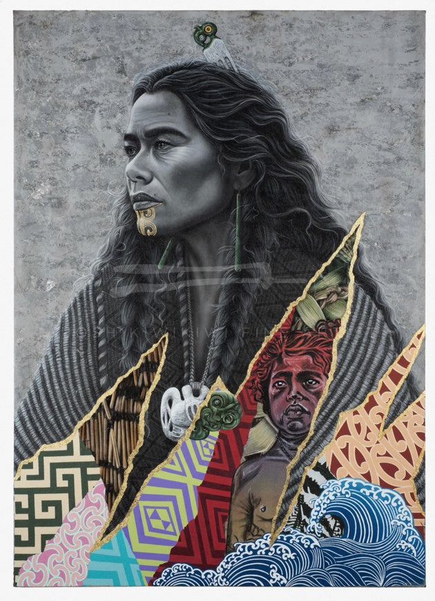 The surface, textured like concrete, recalls the urban world, yet woven through it are patterns, colour, and gold leaf — markers of vitality, tradition, and identity. Gold-filled tears run across the work, inspired by kintsugi, symbolising both the fracture of cultural loss and the beauty of reclamation. The wahine stands as pou — contemporary and ancestral — a guardian and guide, holding balance between te ao hurihuri (the changing world) and te ao Māori.
