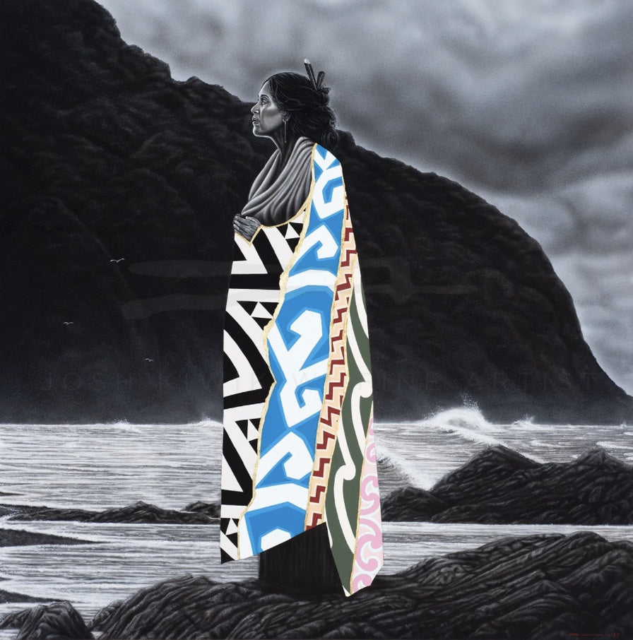 At its centre stands a wāhine cloaked in a korowai of five distinct patterns, each thread holding whakapapa, memory, and renewal. Gold-filled seams trace her body like kintsugi, symbolising fracture and healing, the beauty of culture reclaimed and made whole again.