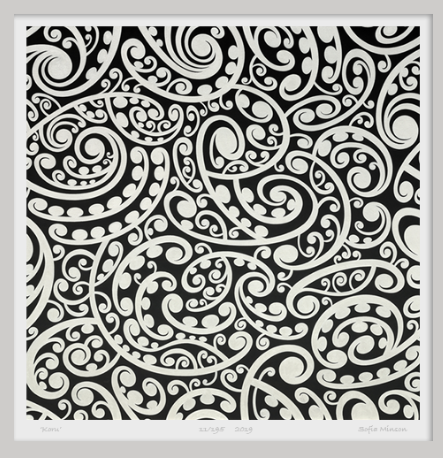 "We are the river flow of Light Divine - He awa pari tātou i te Aho Nō te Atua. This heart exploding, inspirational blessing, is just how I feel when I look at this painting "Koru" that dances with the never-ending fractaling of pearlescent light, in the pregnant womb of Te Pō, the darkness."